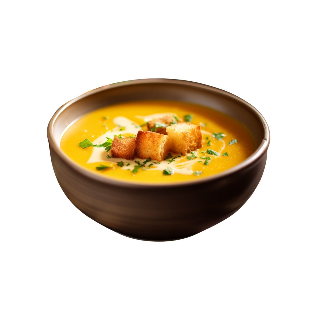 Ароматна крем супа от моркови, лук, тиквичка и картофи, овкусена със сол и черен пипер. Сервира се с включени хрупкави крутони.