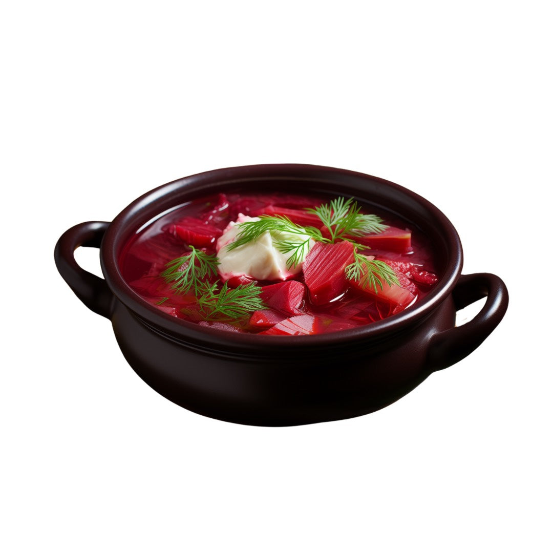 Наситена и ароматна традиционно украинска супа с картоф, лук , морков, домати, цвекло и зеле, с пилешко или свинско месо (според наличността), подправена със сол, оцет, слънчогледово олио, бахар, чесън, черен и червен пипер. Сервира се с включена пухкава сметана, пресен магданоз и филийка хляб/крутони.