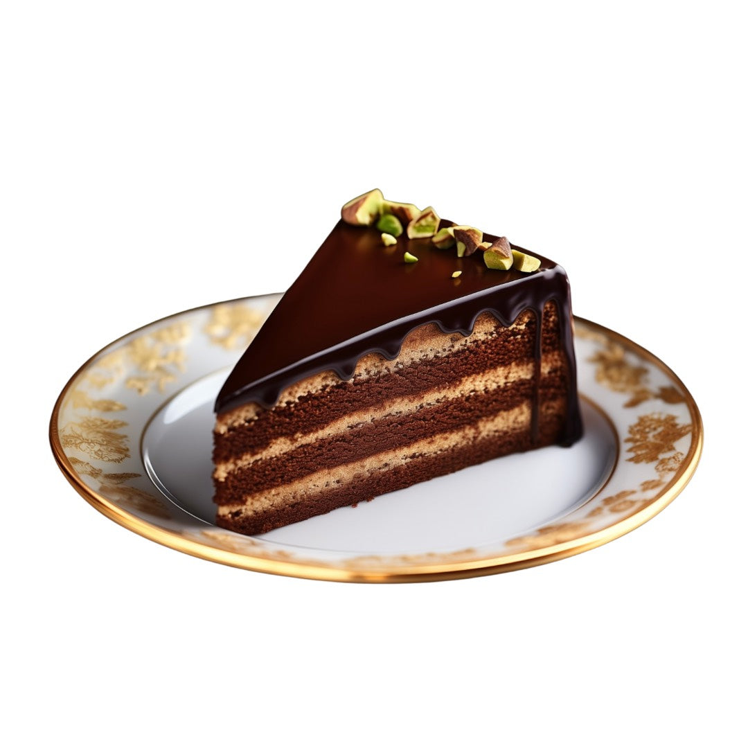 Торта Гараш с фин черен шоколад и пухкав орехов блат. Укръсена с парченца шамфъстък.